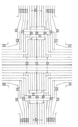 圖1是實(shí)用新型的橋體結(jié)構(gòu)圖路口的中間部位為縱向高架橋101,供縱向直行車輛通過路口,路口兩端架設(shè)縱向路面橋102(上起一高架車道),橫向中間直行車道103為雙盆形地下車道,縱向高架橋101下方隆起至地面,盆底部位上方為縱向路面橋102,車行道路不架設(shè)橋墩,縱向路面橋橋基(代橋墩)104、縱向高架橋橋基105(代橋墩)占用各轉(zhuǎn)彎掉頭車輛共用橫向車道路基??v向高架橋橋墩位于橫向道路中心線上所標(biāo)101位置。