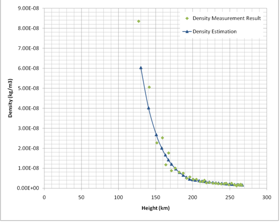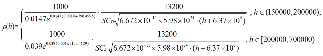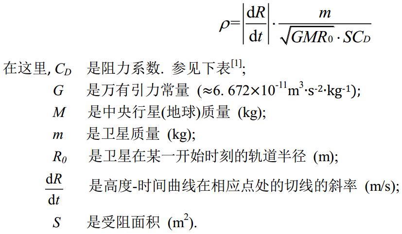 這種模式是否具有實(shí)用意義主要取決于離子在工作環(huán)境中是否充足, 即是說, 我們首先必須先測出高層大氣的近似的密度. 又因?yàn)樗? 無法直接測量, 我就想出一種間接的方法: 通過測量不受控制的近地軌道衛(wèi)星的軌道高度的自然衰減. 由于密度可由作用于衛(wèi)星上的大氣阻力大小求出, 這個(gè)阻力間接地體現(xiàn)在衛(wèi)星高度衰減上, 因此通過計(jì)算我們得出密度ρ (kg/m3 ):