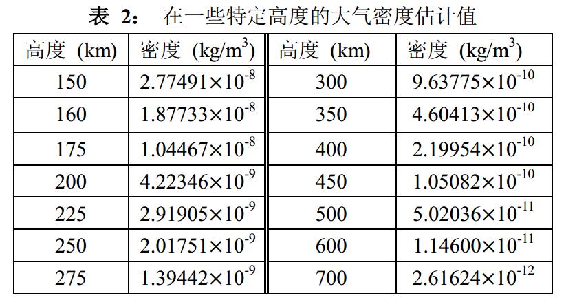 通過查閱相關(guān)參數(shù)數(shù)據(jù)得到衛(wèi)星質(zhì)量m=13200kg, 并假設(shè)衛(wèi)星受阻面積為16m2, 對(duì)地軌道速度為7800 m/s, 即Ma= 22.9. 從表 1中我們可以得到相應(yīng)的CD=0.11283. 從ρ(h)函數(shù)關(guān)系可以解出如下表所示的在一些特定高度的大氣密度估計(jì)值.