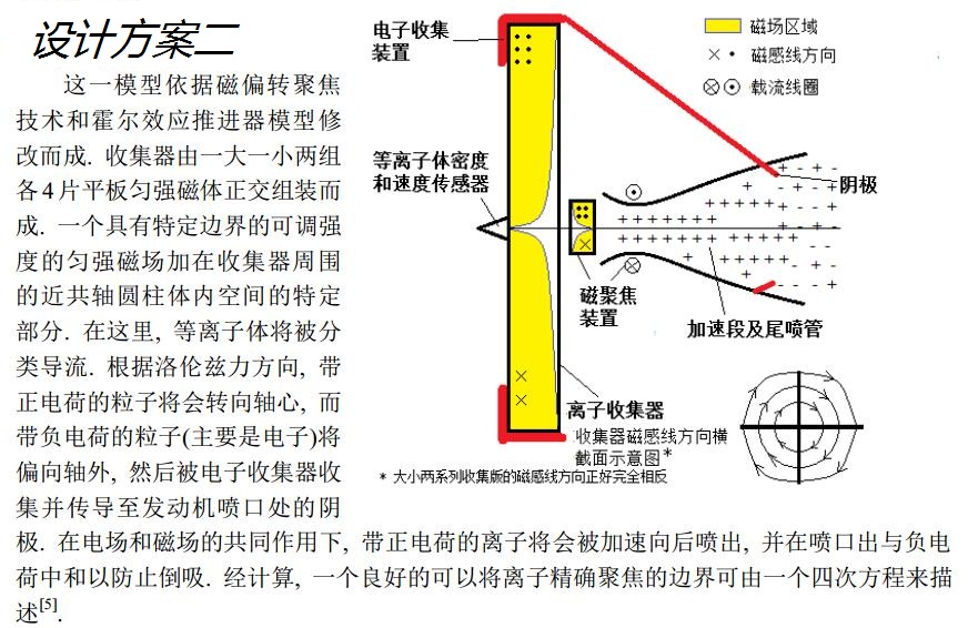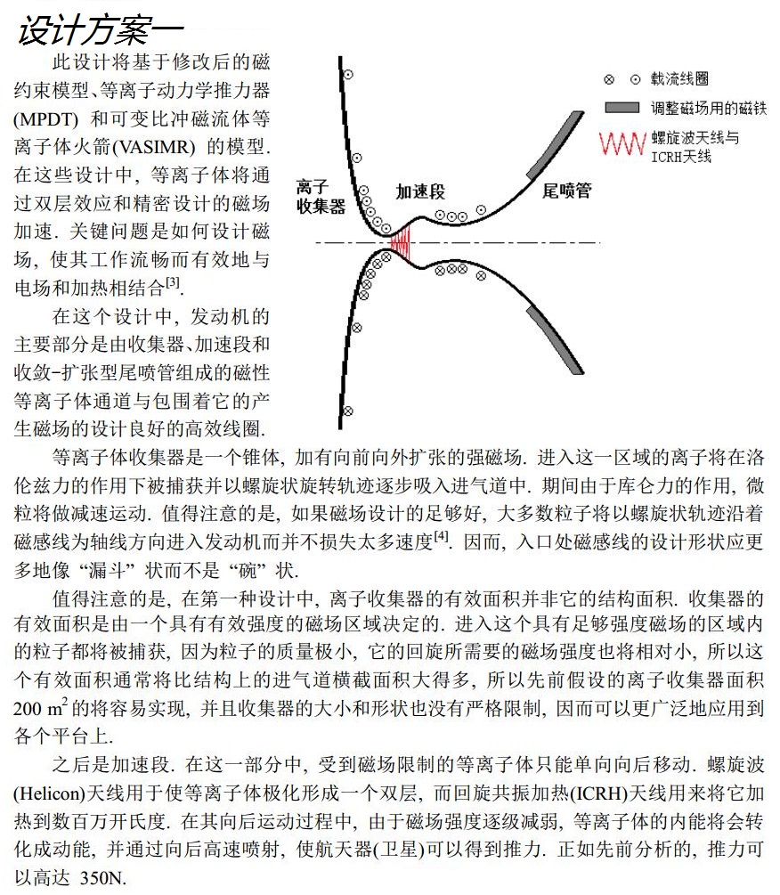 這一事實(shí)讓我想起了使用的離子推進(jìn)器的衛(wèi)星, 如SMART和DAWN衛(wèi)星等. 離子推進(jìn)器的廣泛應(yīng)用說明了人類在短距離小空間內(nèi)加速離子的技術(shù)日臻成熟. 這也同時(shí)讓我考慮到一個(gè)新的模型——融合傳統(tǒng)離子推進(jìn)器和沖壓發(fā)動(dòng)機(jī)的設(shè)計(jì), 讓等離子體代替空氣進(jìn)入進(jìn)氣道, 然后使用電場和磁場來加速, 以取代化學(xué)燃料的燃燒. 這就是我的想法的概述.