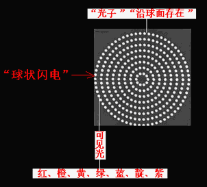 “棒電極”在球心對(duì)“球冠電極”“超短時(shí)間內(nèi)的高能”(超高壓)充電、放電,可以產(chǎn)生“球狀閃電”,其機(jī)理為:“雙向激擊”、“球冠振蕩”。若地面為“球冠電極”,則表現(xiàn)為“滾地雷”“火球”,若空中云為“球冠電極”,則表現(xiàn)為空中“光球”。因?yàn)椤扒蚬谡袷帯钡念l率的不同,“球狀閃電”內(nèi)部呈現(xiàn)“嵌套球狀”,由外向里頻率由小到大,在可見光波段由外向里顯現(xiàn)為紅、橙、黃、綠、藍(lán)、靛、紫,而由外向里看,因疊加合成呈現(xiàn)白色,但是,當(dāng)最外面的頻率較小時(shí),也可能是黃色或綠色或藍(lán)色的;一個(gè)大“光球”,可以分離為兩個(gè)或幾個(gè)小“光球”,但其顏色將會(huì)“變深”(如圖6、7)。 [6]
