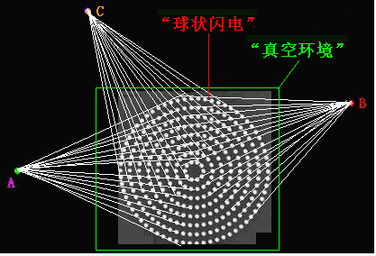 如圖12,A、B、C等處的光源發(fā)出的光線,在通過“球狀閃電”時(shí),都在“球狀閃電”中的“光子流體能量負(fù)壓”的作用下,被“吸入”“留住”作“圓周運(yùn)動(dòng)”,而不能穿過“球狀閃電”,光源對(duì)面的觀察者將不能看到這個(gè)光源發(fā)出的光線——呈現(xiàn)“黑洞效應(yīng)”。