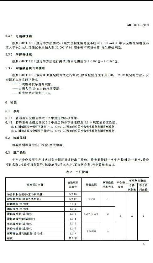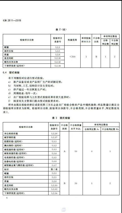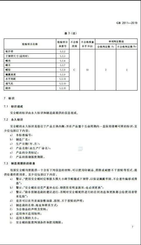 · 修改了標(biāo)準(zhǔn)適用范圍 · 修改了部分術(shù)語和定義的措辭,并刪除了部分術(shù)語 · 增加了安全帽的分類 · 修改了對(duì)于安全帽質(zhì)量的要求 · 修改了對(duì)于佩戴高度的要求 · 修改了對(duì)于通氣孔的要求 · 修改了對(duì)于耐低溫性能的要求 · 增加了對(duì)于耐極高溫性能的要求 · 修改了對(duì)于電絕緣性能的要求 · 修改了對(duì)于防靜電性能的要求 · 增加了對(duì)于耐熔融金屬飛濺性能的要求 · 修改了對(duì)于安全帽永久標(biāo)識(shí)的要求 新版的GB2811-2019規(guī)定,在安全帽內(nèi)側(cè),全生命周期內(nèi)必須清晰保持以下6項(xiàng)標(biāo)識(shí): a)本標(biāo)準(zhǔn)編號(hào); b)制造廠名; c)生產(chǎn)日期(年、月); d)產(chǎn)品名稱(由生產(chǎn)廠命名); e)產(chǎn)品的分類標(biāo)記; f)產(chǎn)品的強(qiáng)制報(bào)廢期限。 原文如下: