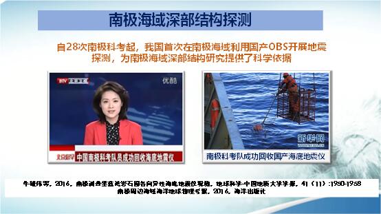 在南極地區(qū),我國有二處陸上地震臺站。在第28次南極科考時投放了海底地震儀,過了一年,在第29次南極科考船去那片海域回收時,因那片海域結(jié)冰,沒法回收。根據(jù)設(shè)計,海底地震儀最大留海時間為一年,大家都擔(dān)心失掉這兩臺儀器了??上驳氖牵诌^了一年那片海域已經(jīng)沒有冰了,在回收時,海底地震儀竟然浮到海面,這是在海底記錄時間最長的一次試驗。也為南極海域深部結(jié)構(gòu)研究提供了科學(xué)依據(jù)。