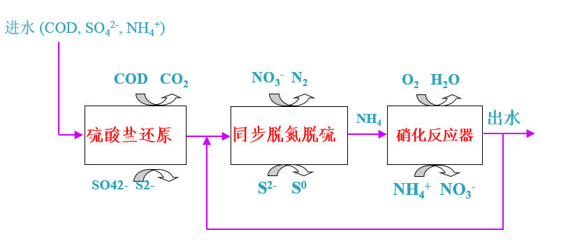 同步除碳脫氮脫硫體系:由硫酸鹽還原、碳氮硫同步脫除和硝化三個(gè)階段組成(圖2-6)。