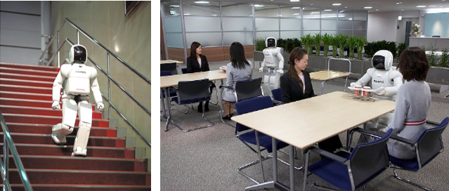 種服務(wù)機器人很多,比較有代表性的是日本的新一代仿真機器人,看看它現(xiàn)在都能干什么。這個機器人上邊是有眼睛的,還有各種各樣的傳感器。它現(xiàn)在已經(jīng)可以跑得很快,每小時跑九公里。它可以聽得懂三個人同時發(fā)的命令,能簡單對話。這個手已經(jīng)很靈巧了,能擰杯子。它可以主動繞開對面走過來的人,有的時候靠視覺,有的時候靠身上其他東西。能踢球,做手語。我們希望這樣的機器人能早點進入我們的生活,但是有兩個問題沒解決,一個是電源,充滿電只能工作半個小時,再一個,智能還差的很多。