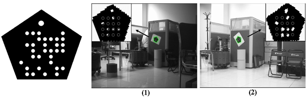 圖6 面向機器人視覺系統(tǒng)的MR-二維碼,左圖是MR-二維碼,右圖(1)和(2)是MR-二維碼在不同光照下的識別效果